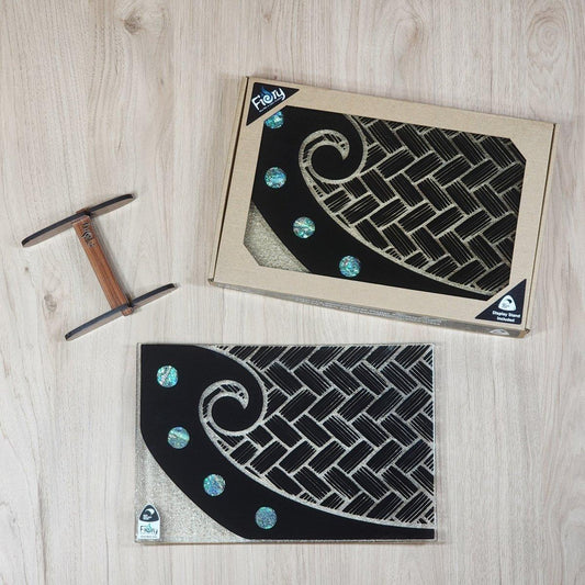NZ Made Glass Paua Platter/Plate Koru Kete - Blk w/stand