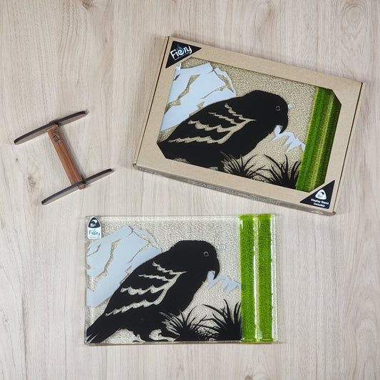 NZ Made Glass Platter/Plate - Native Kea/Mt Cook - Blk/Wht/Olive w/stand