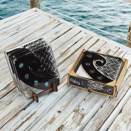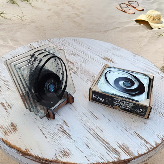 NZ Made Glass Paua Coasters Koru Kete - Blk - 4Pk w/stand