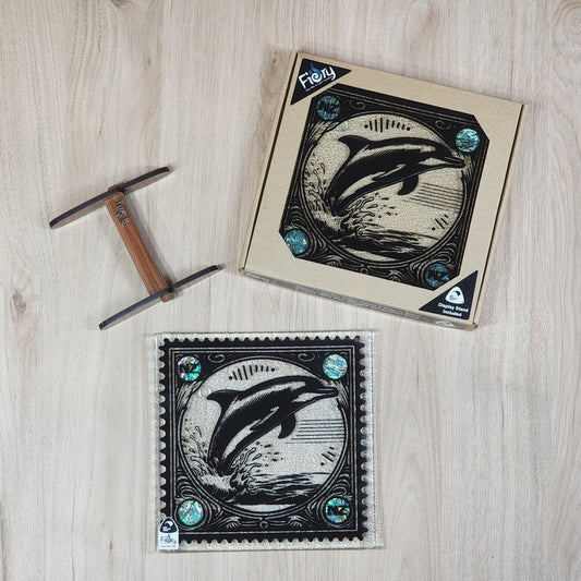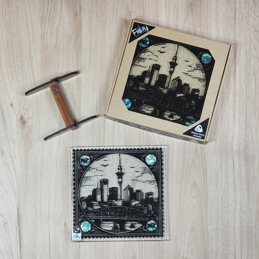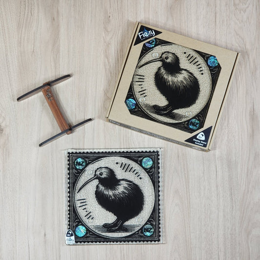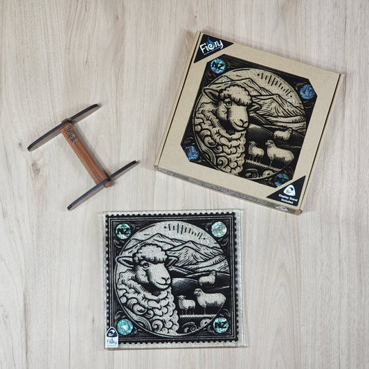 Evoking nostalgia for days gone by, the Stamped Range celebrates New Zealand’s iconic creatures and landmarks with designs that resemble vintage stamps or lino cut prints. Each piece features a bold black glass print, adorned with vibrant paua-inspired dots in each corner for a touch of Kiwi flair.