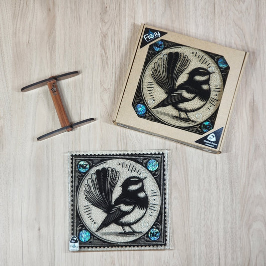 NZ Made Glass Paua Platter/Plate - Stamped Fantail Piwakawaka - w/stand